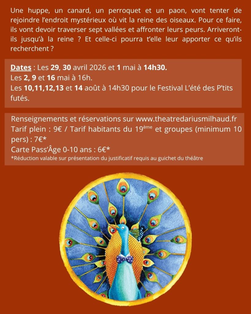 Publié par sandrine Monlezun le 24 mars 202624 mars 2026 Très heureuse de partager l’affiche pour la série de dates au Théâtre Darius Milhaud en avril et mai 2026 !! 6 représentations, dans ce très chouette théâtre familial, et je proposerai le livre en dédicace à la fin !! Partager : Partager sur X(ouvre dans une nouvelle fenêtre) X Partager sur Facebook(ouvre dans une nouvelle fenêtre) Facebook J’aime chargement… Similaire